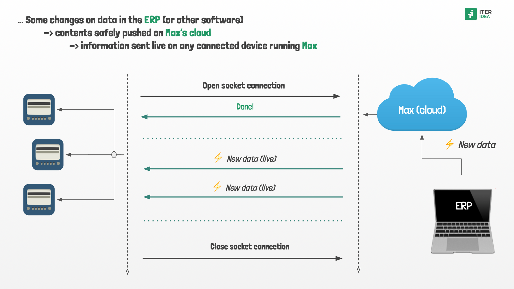 With the new model, when a piece of data is generated on the ERP (or other software) and pushed to Max's cloud, the generated information is automatically distributed, live, to any device running the app, through a secure socket connection.