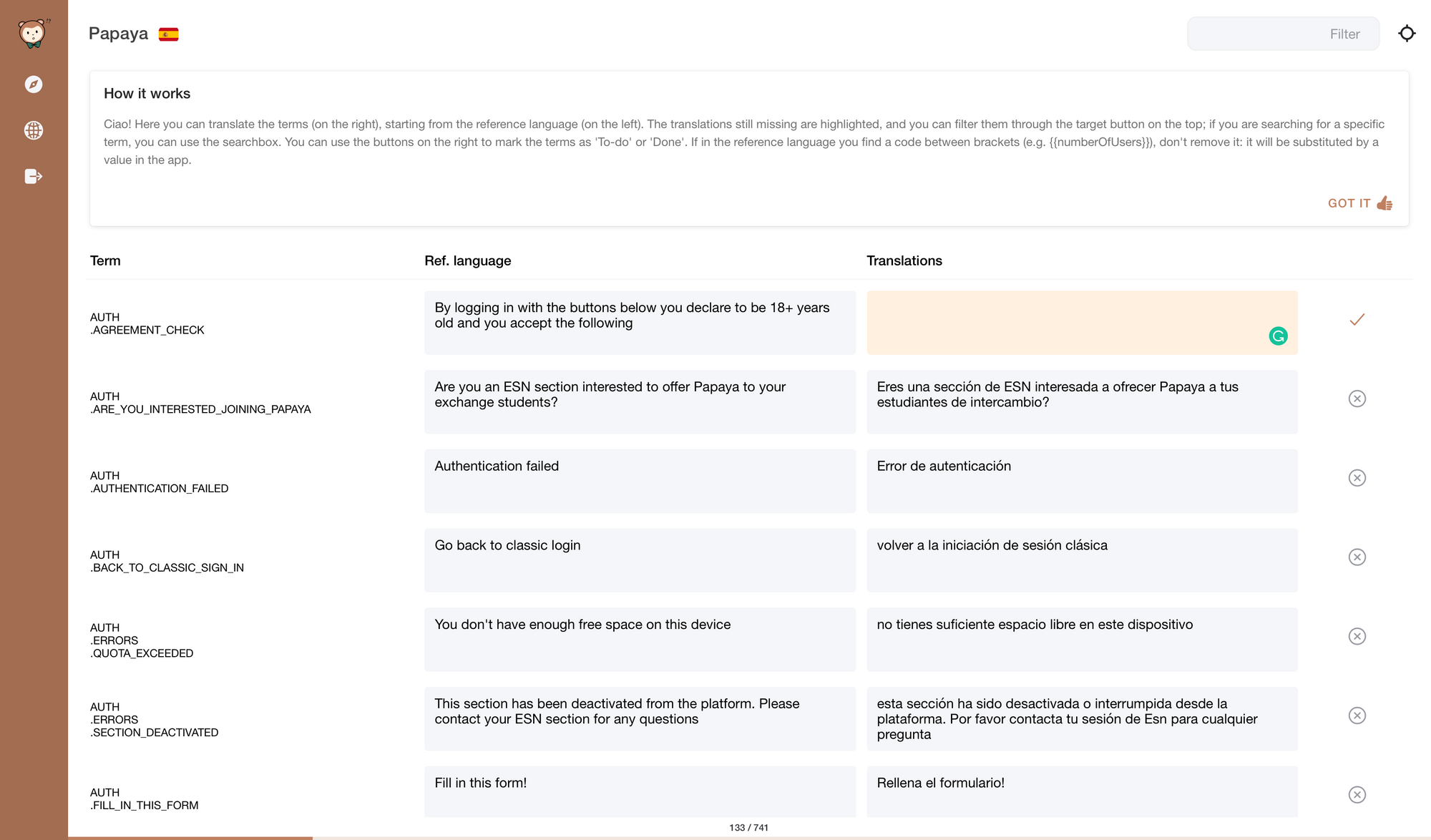 In this process of remote aided-translation, we usually had to exchange several files containing the different sentences and words used in our products. It was neither handy nor user-friendly. Of course, there are platforms out there that offer support towards this objectives, but we didn't find any affordable solution which suited our interests (and our liking).