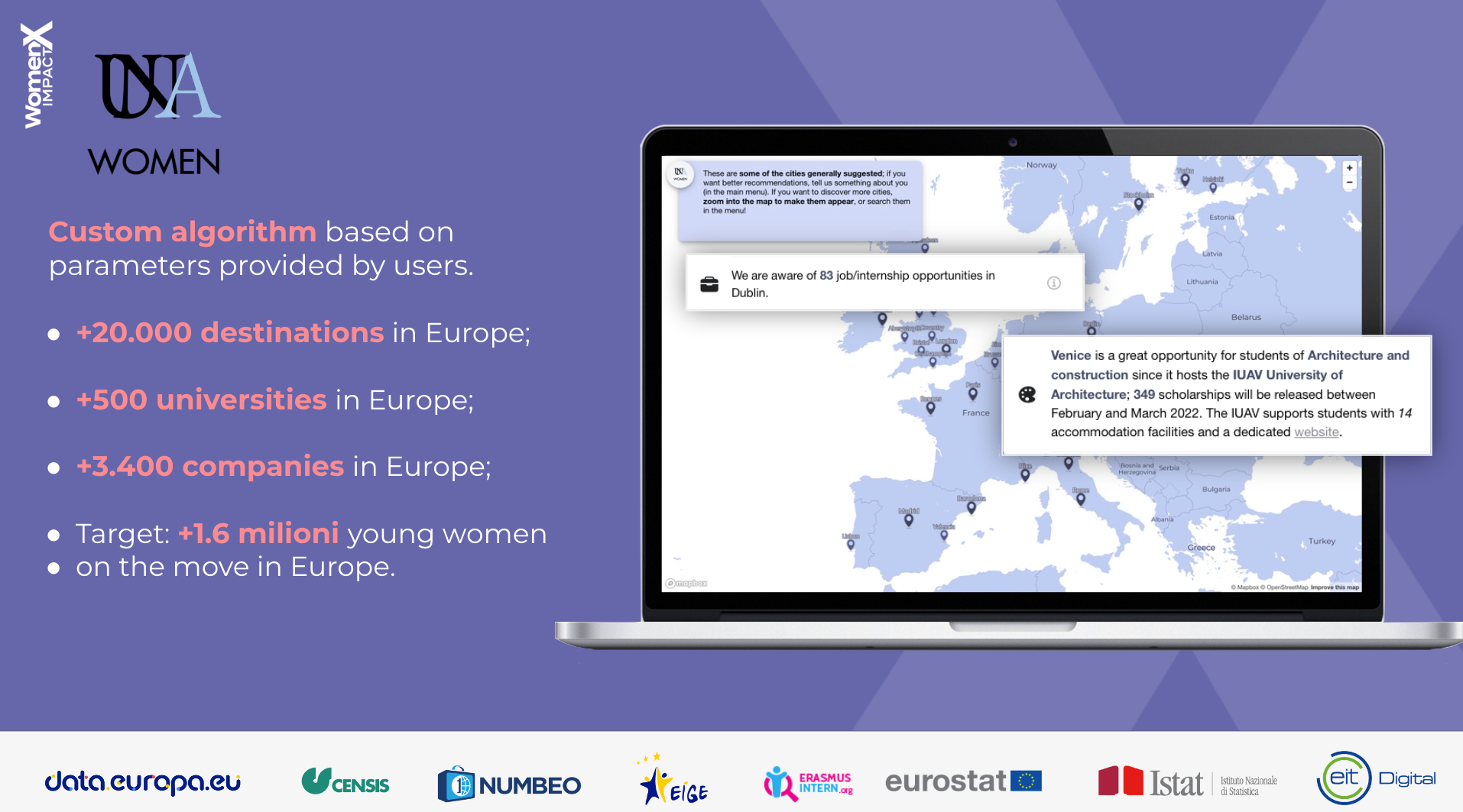 The solution supports users, particularly young women, in discovering and exploring the most suitable European opportunities based on their professional and non-professional characteristics or desires.