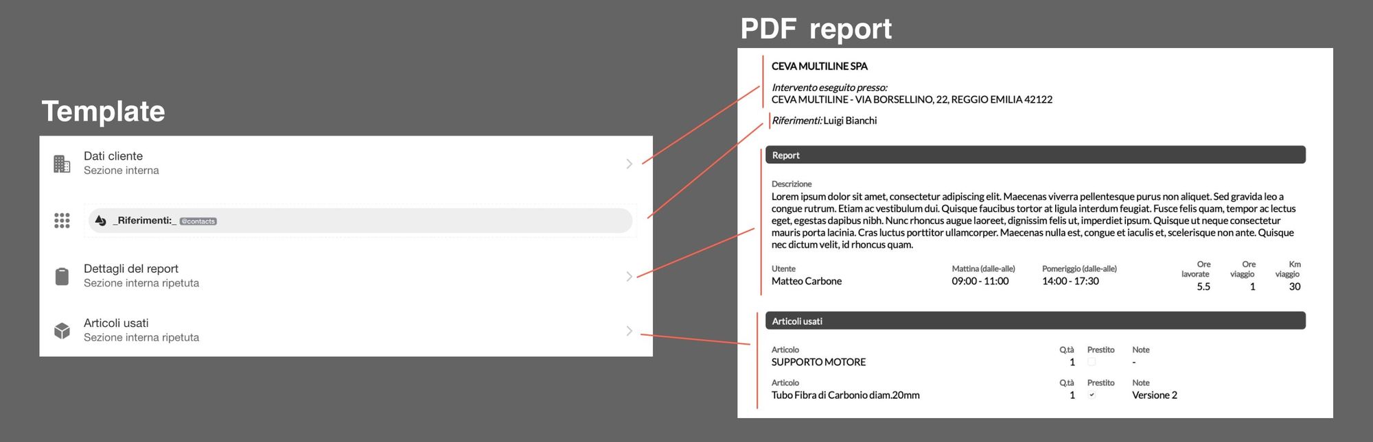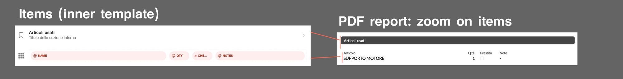 By taking advantage of many sections (customer's data, report detail, users detail, items used, etc.), you can go deep in your customisation, and decide which fields to show for each row and how much space they should occupy. You can see an example of the Items used inner section (and how the final result looks) here below.