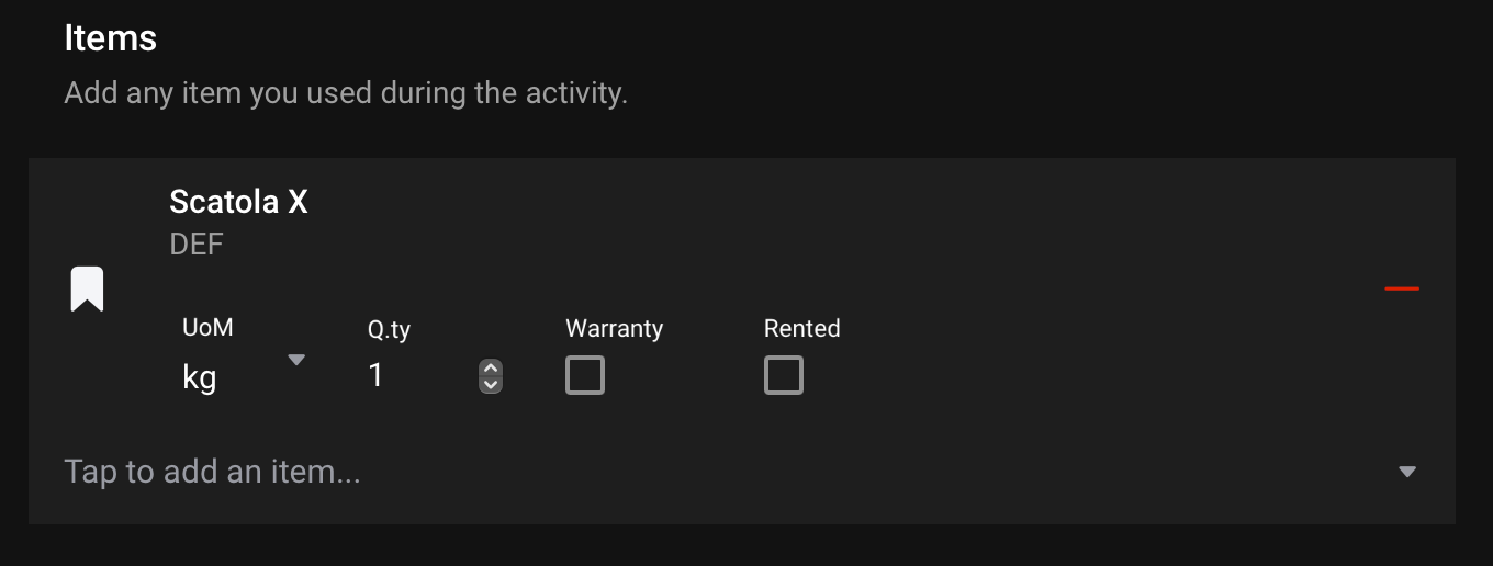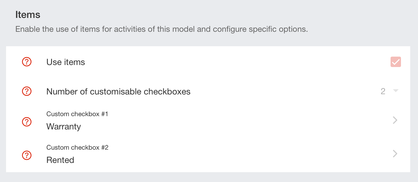 Another cool feature of this new version of Scarlett allows you to define custom checkboxes to make available when using items in an activity. Common scenarios are: items that you rent, items that you give based on a warranty, etc. As always, you decide!