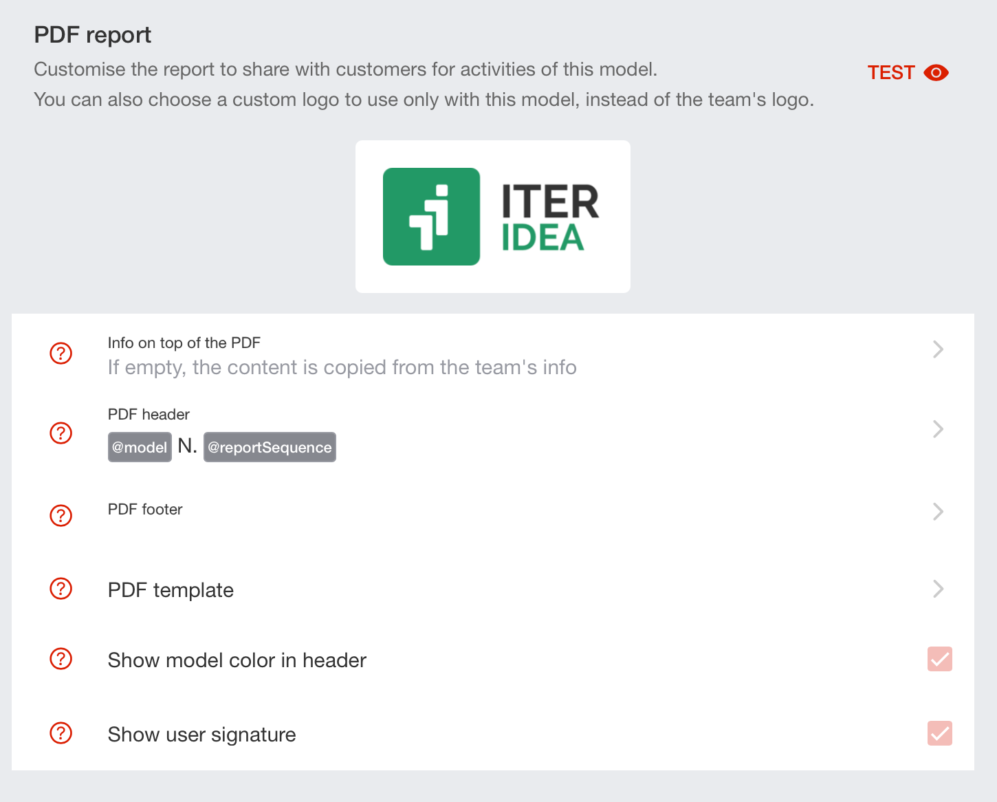 You can change the logo, the header and footer information, the colours and, of course, the template of the PDF. The new template builder, accessible from the PDF template option, it's straightforward: you can take advantage of sections and fields to design how the final PDF report will look like. For example, look below how the template in the model configuration resembles the areas of its PDF report.